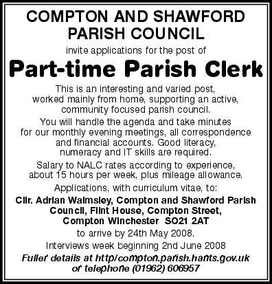Applications are invited for the position of Parish Clerk, preferably with effect from 1st July 2008.