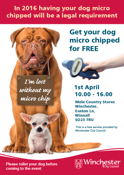 You can go to a vet to have your pet microchipped, but why not come to Winchester City Council’s free session on April 1? The event will last from 10am to 2pm at Mole Country Stores, Easton Lane, Winnall, Winchester, Hampshire SO23 7RU. There’s no need to book; just turn up with your dog.