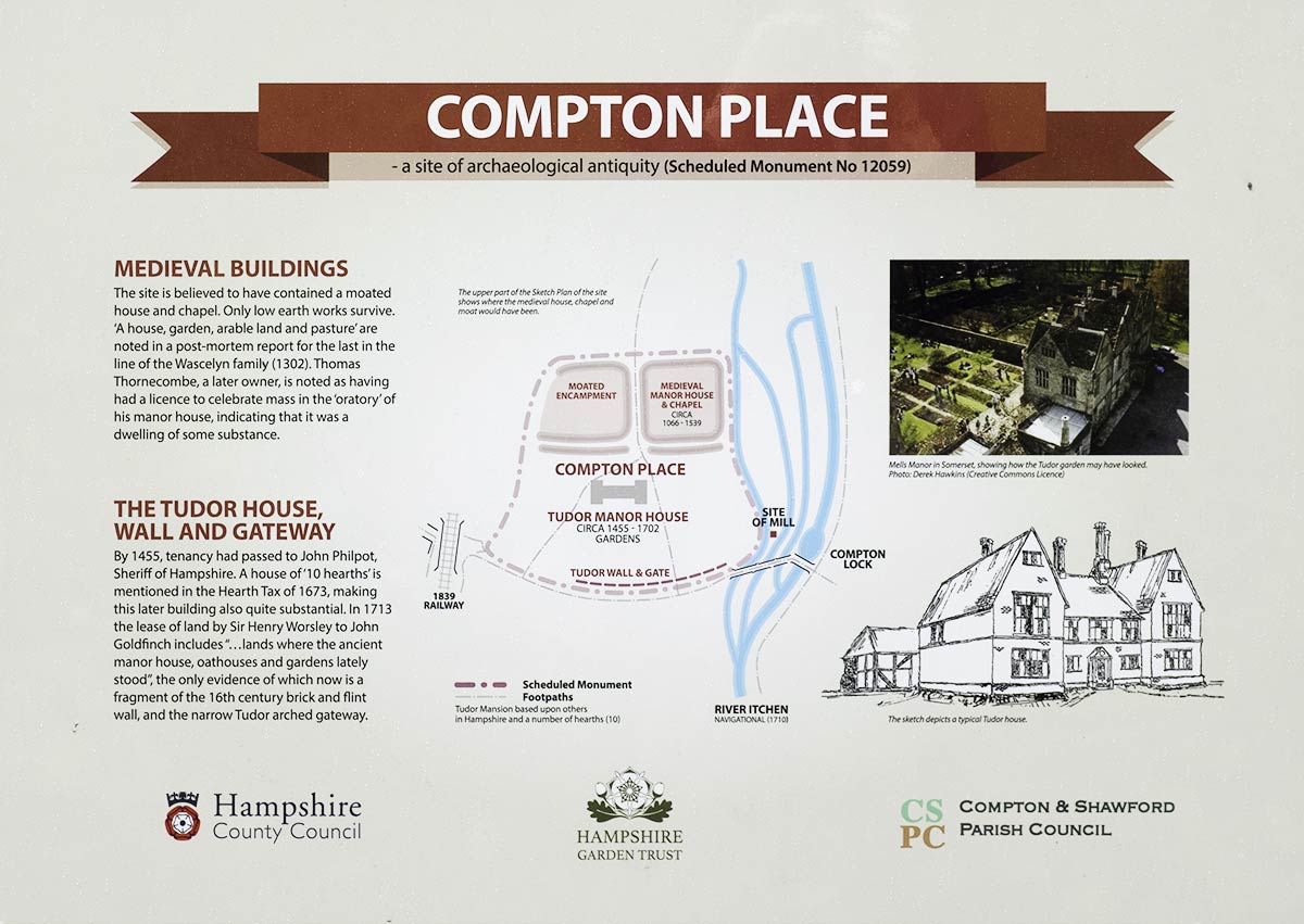 Compton Place (Saxon..Plasce..marshy ground) lies behind the Tudor Wall and gate on the pathway to Compton Lock (footpath 23).