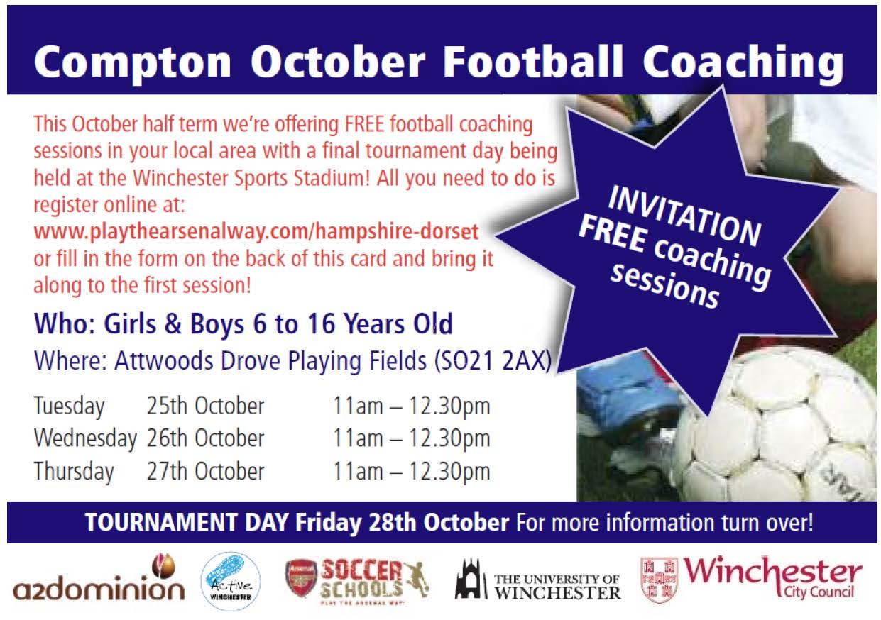 Compton October Football Coaching formIf you come along to any coaching sessions you can come to our final tournament event at Winchester Sports Stadium, Bar End, S023 OQA on Friday 28th October from 12 noon to 4pm.