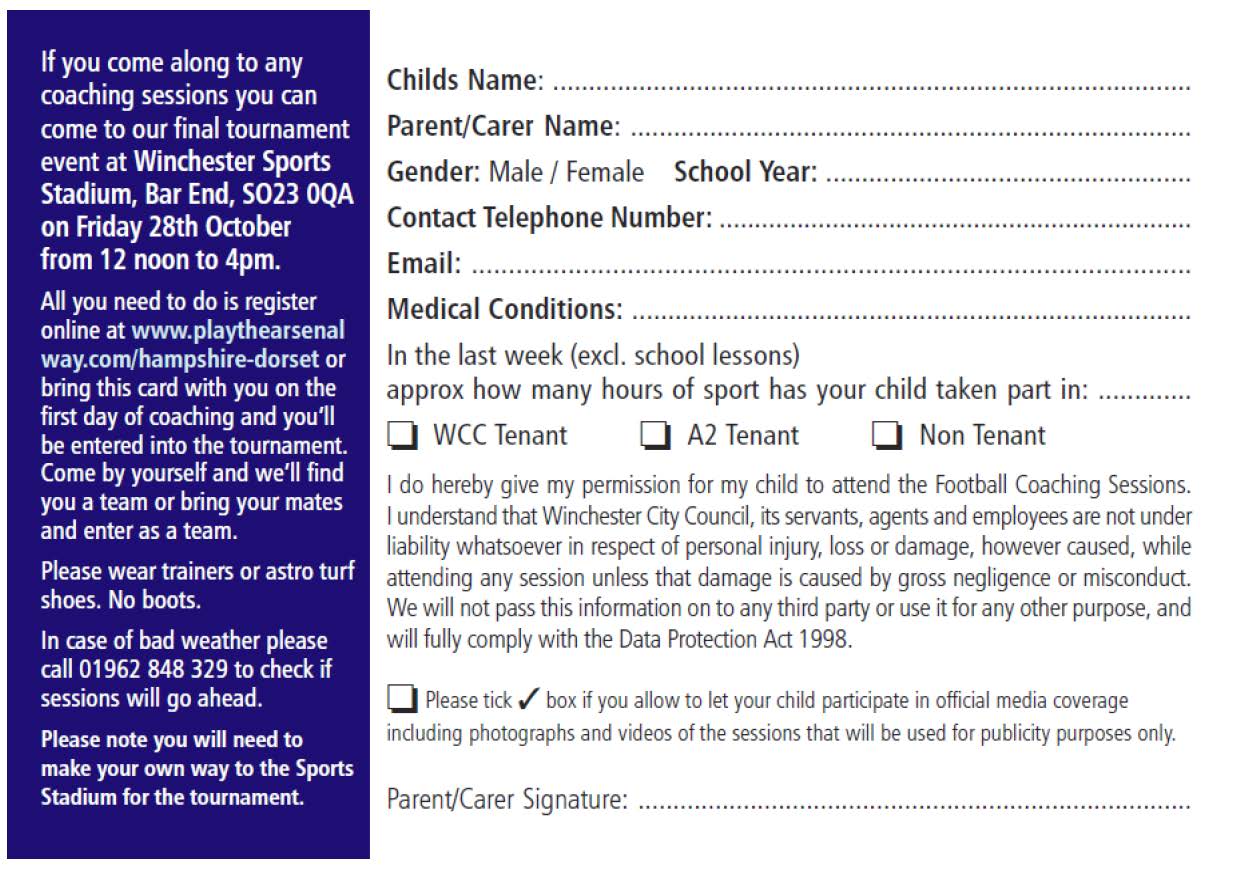 www.playthearsenalway.com/hampshire-dorset or fill in the form and bring it along to the first session!