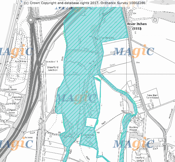 Here is are two static screenshots of the area around Compton Lock, showing just the River Itchen SSSI, and the SSSI with colour-coded priority natural habitats.