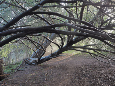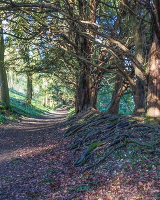 There are both male and female trees and many are hollowed out, some with internal roots and some have further storm damage also many younger yew trees line the remaining paths.